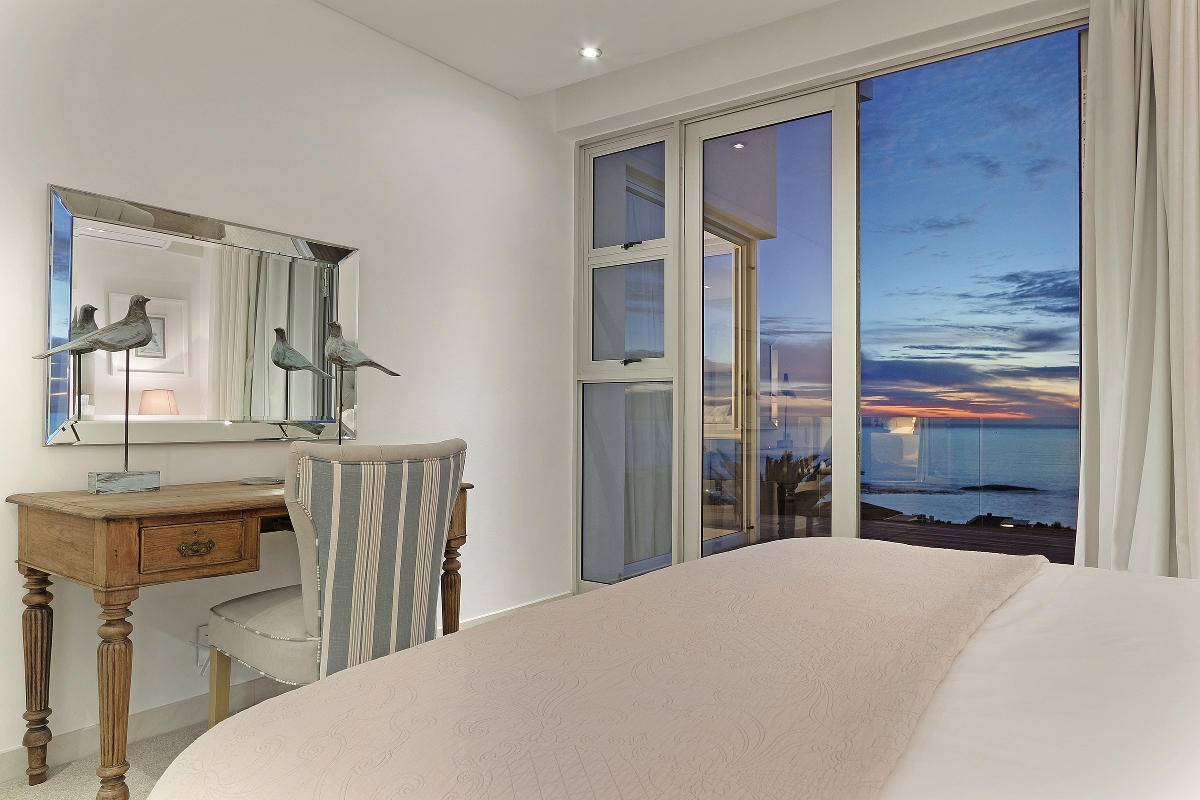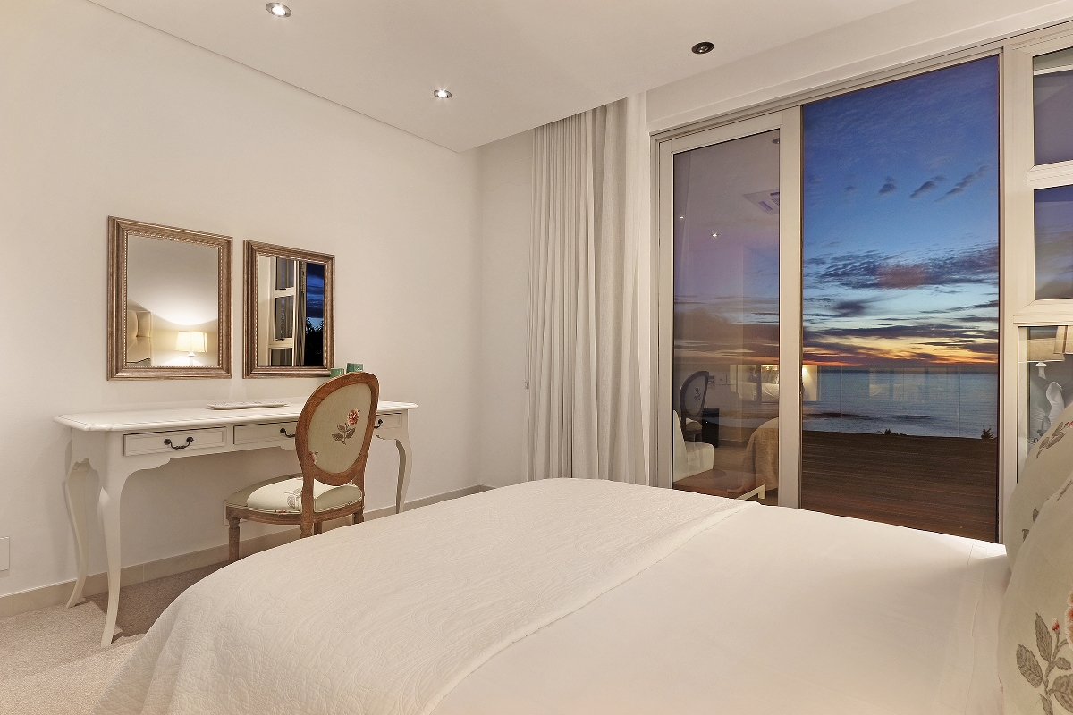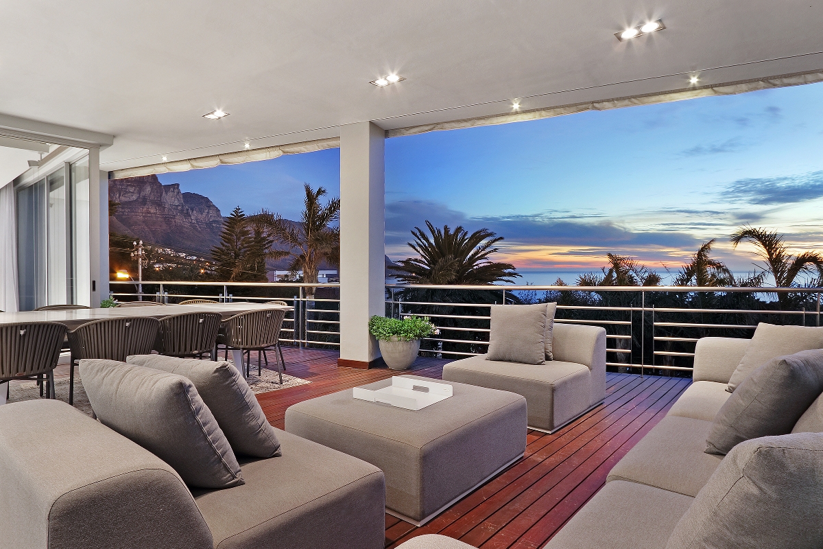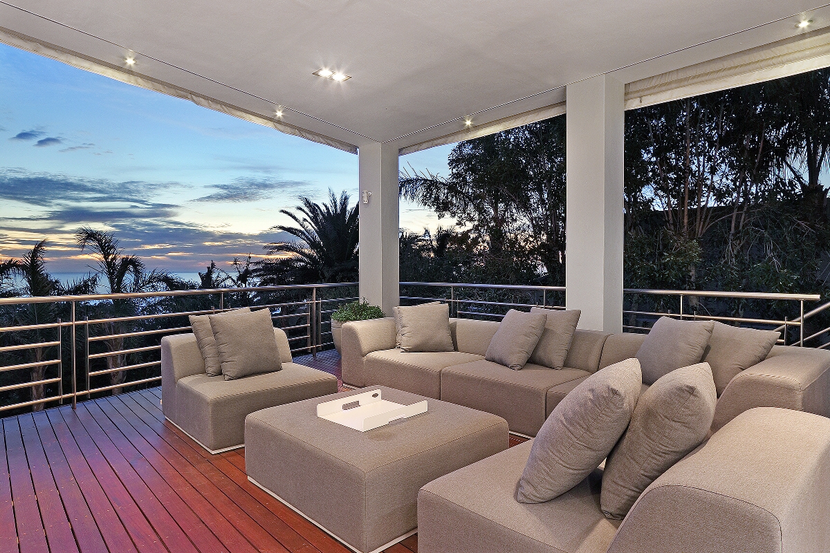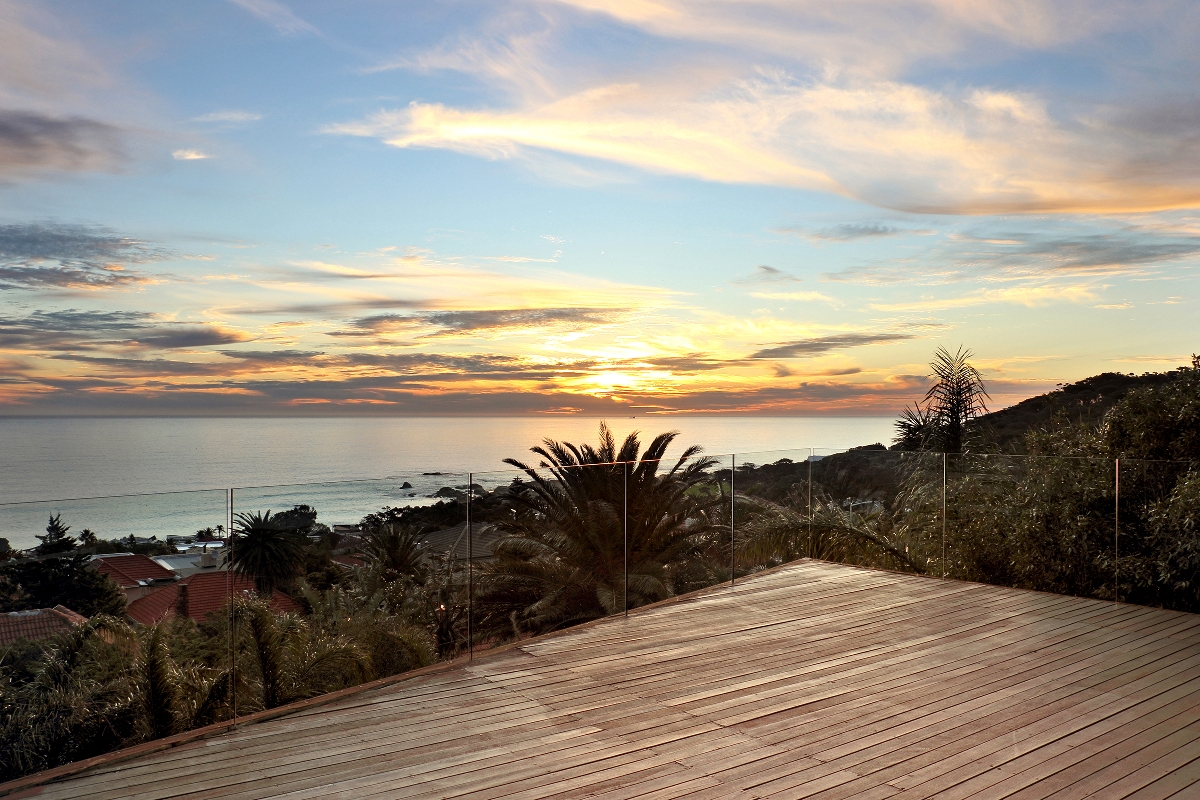 One enters the villa where you find the kitchen, dining and living areas. The lounge area flows onto a wooden terrace that overlooks the Atlantic Ocean and the famous Twelve Apostles mountain range.
