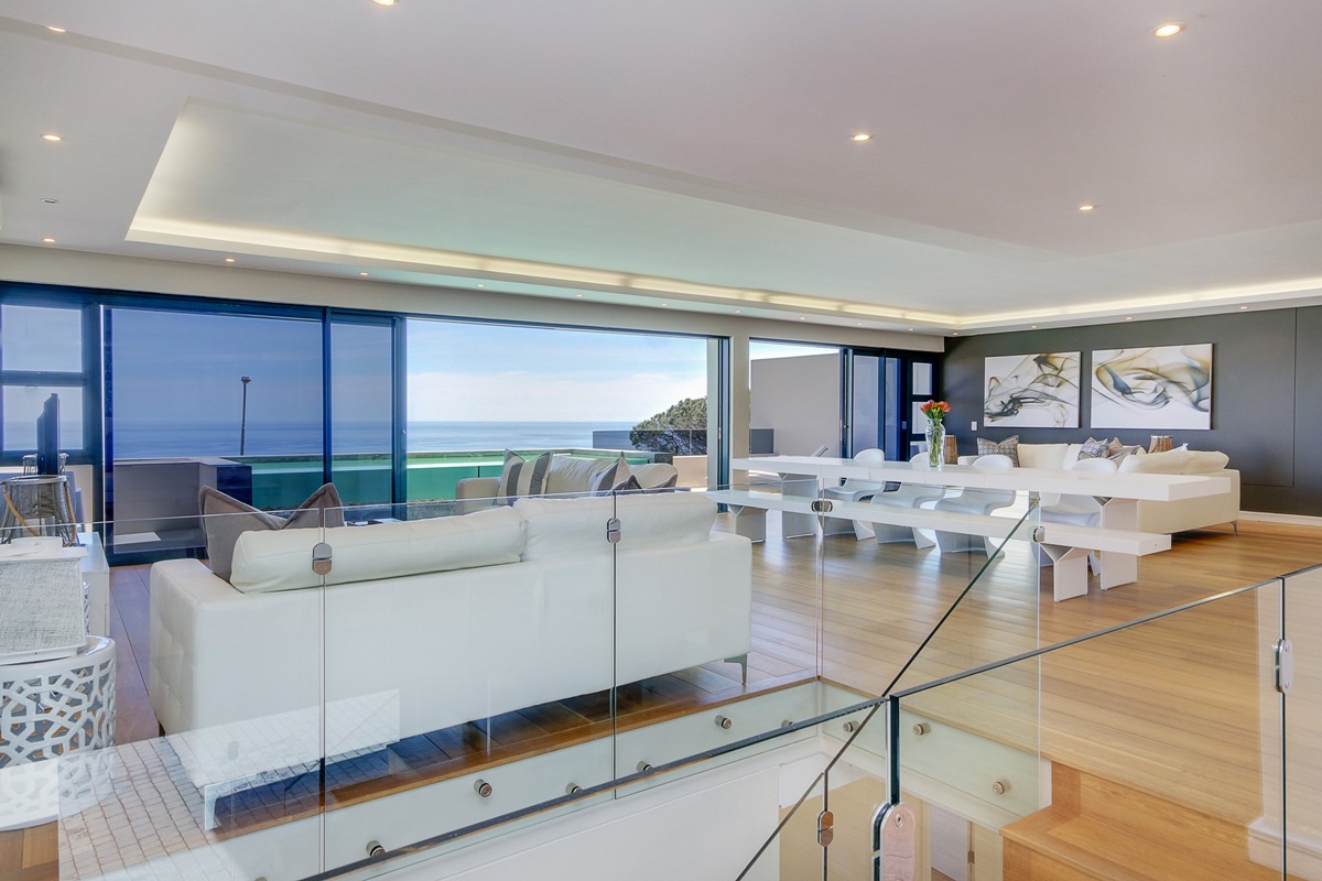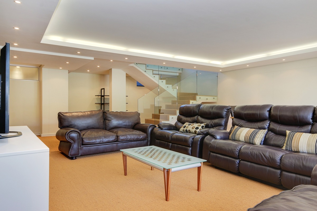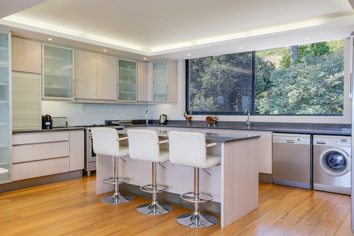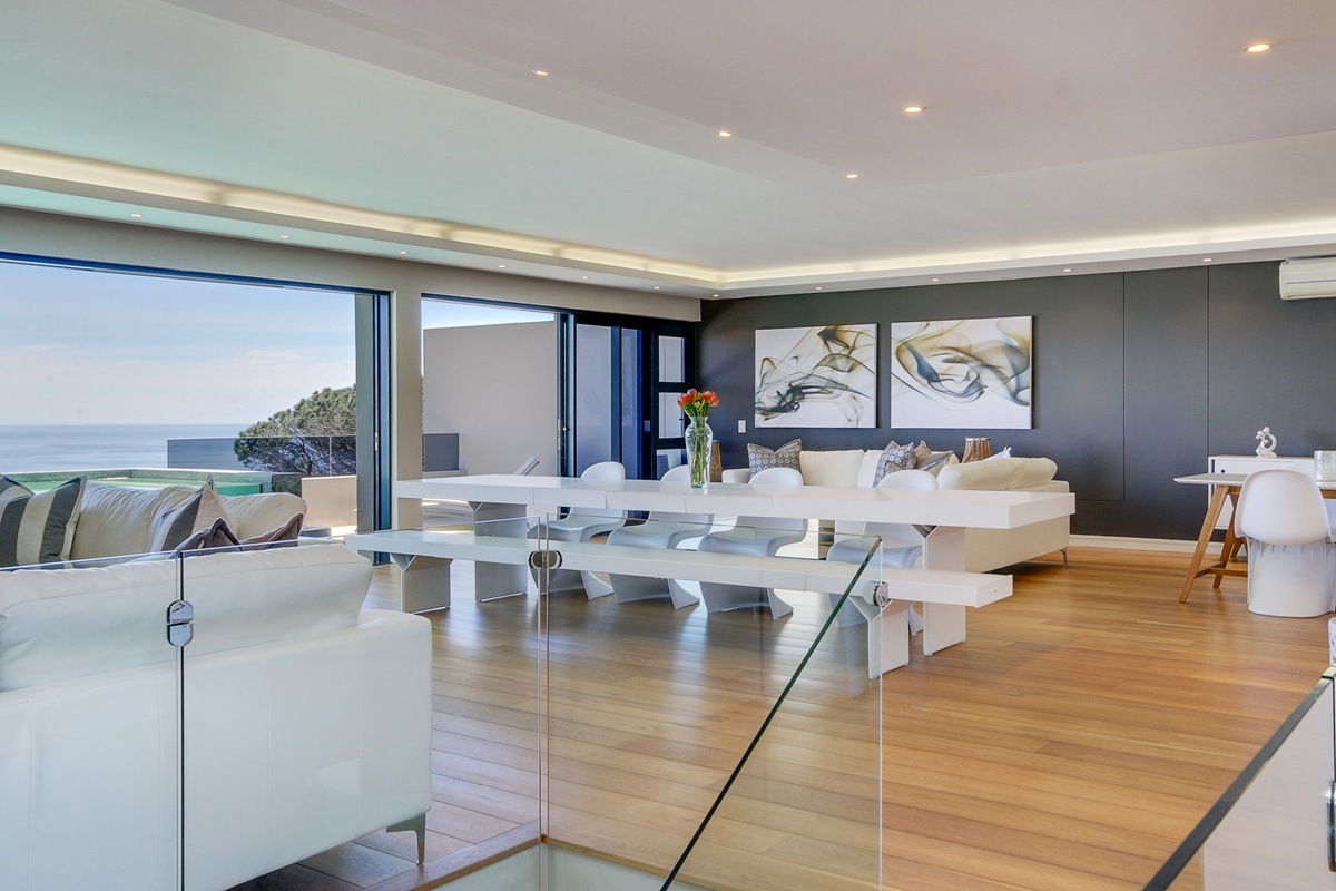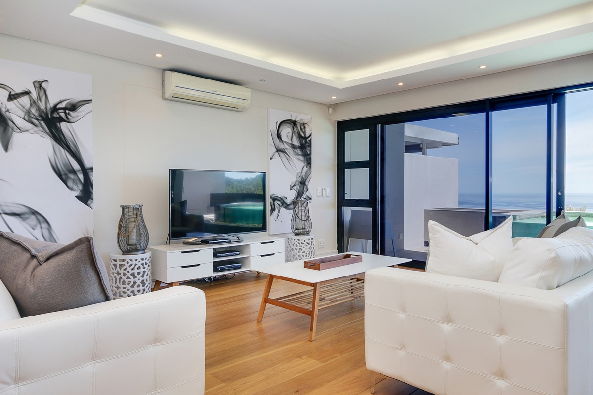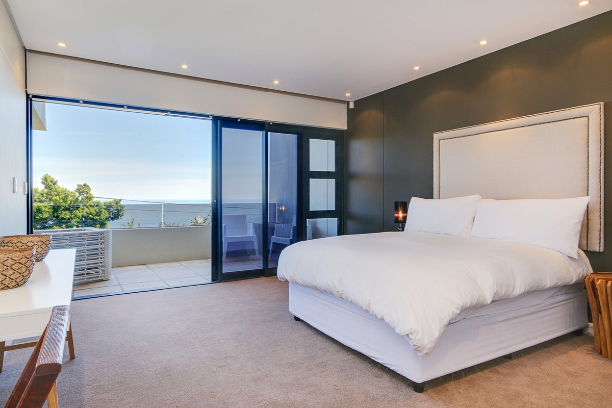Those who enjoy entertaining will love the open plan layout. The kitchen is enjoys garden views and is fully equipped. It also has a breakfast bar with 3 bar stools, a great spot for enjoying morning coffee. This leads onto a large living and dining area, with two lounges and formal dining for 10 guests. Sliding doors offer spectacular ocean views and open onto the balcony. On the ground floor is a cinema room with leather recliners.