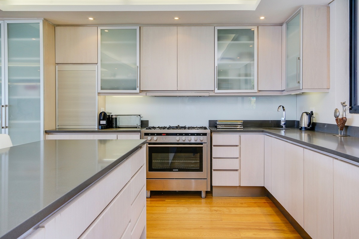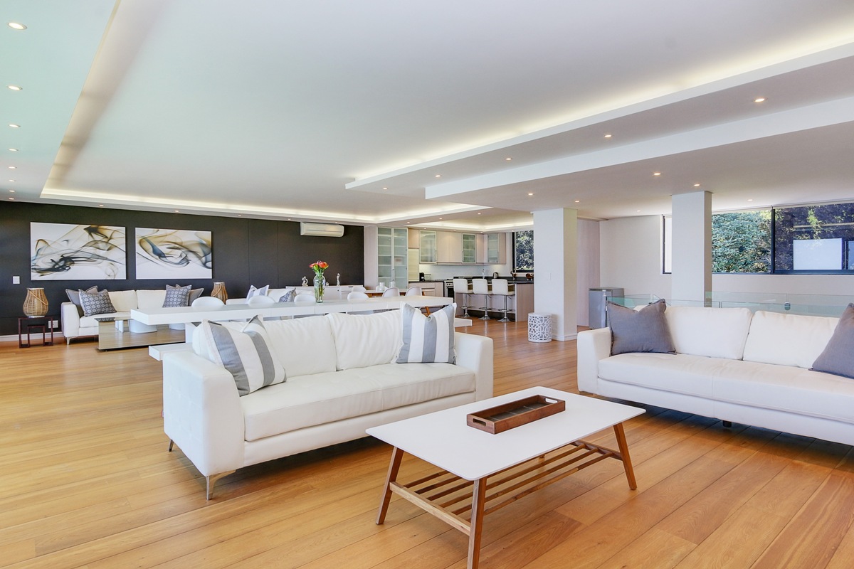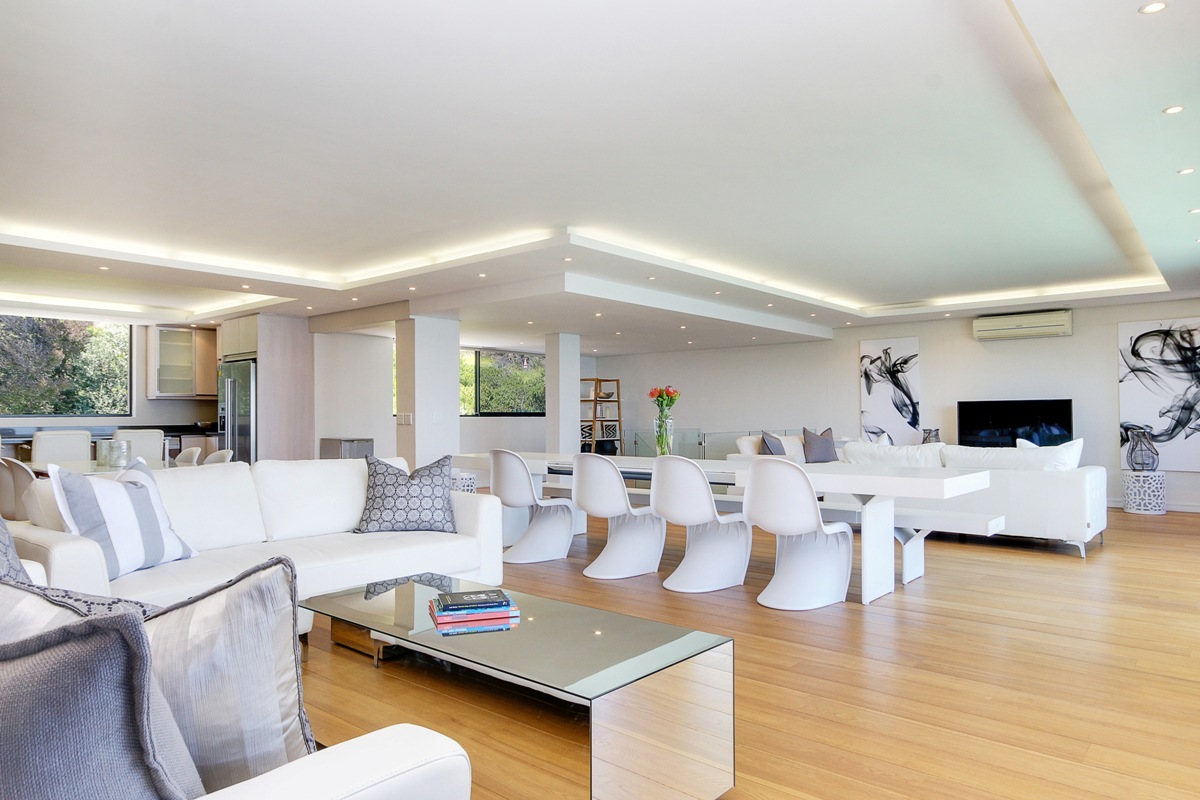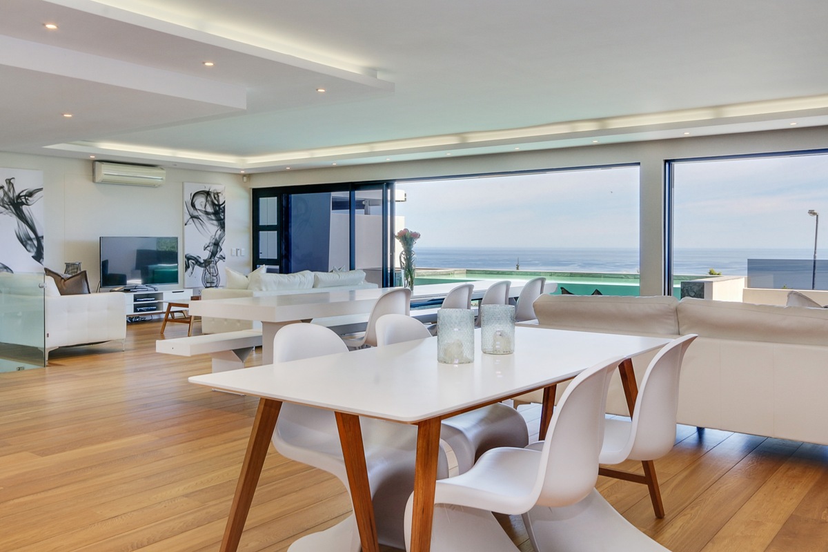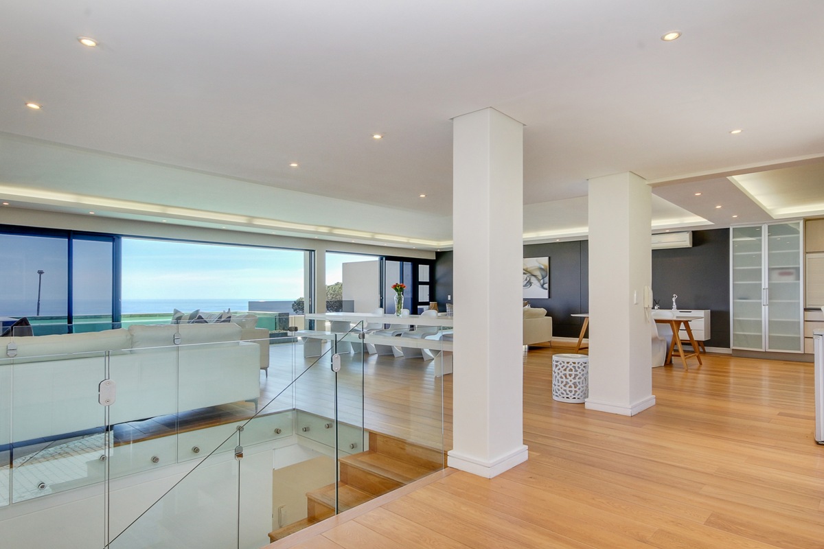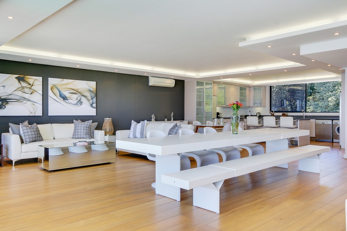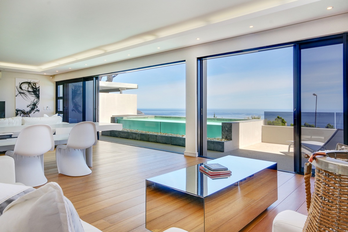 Those who enjoy entertaining will love the open plan layout. The kitchen is enjoys garden views and is fully equipped. It also has a breakfast bar with 3 bar stools, a great spot for enjoying morning coffee. This leads onto a large living and dining area, with two lounges and formal dining for 10 guests. Sliding doors offer spectacular ocean views and open onto the balcony. On the ground floor is a cinema room with leather recliners.