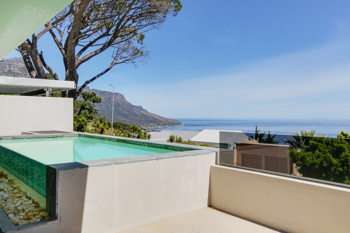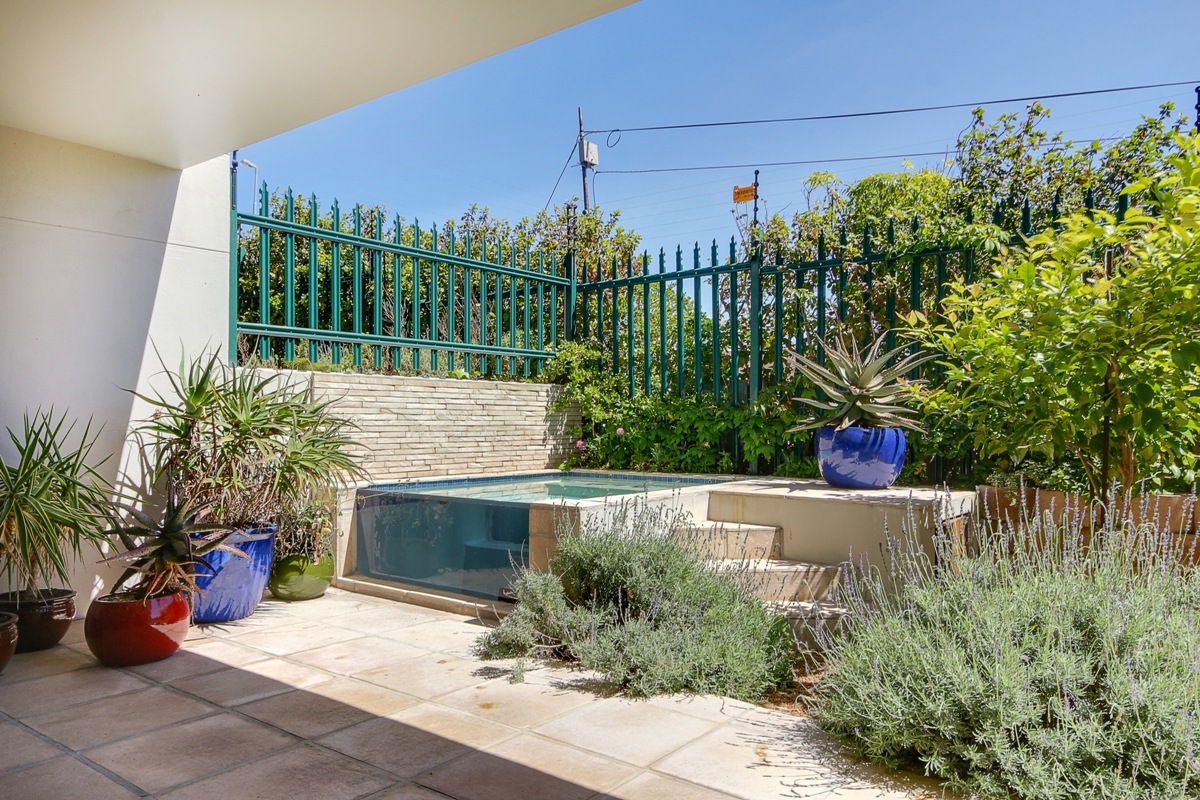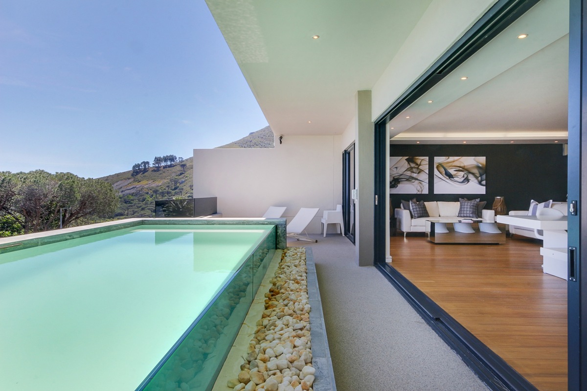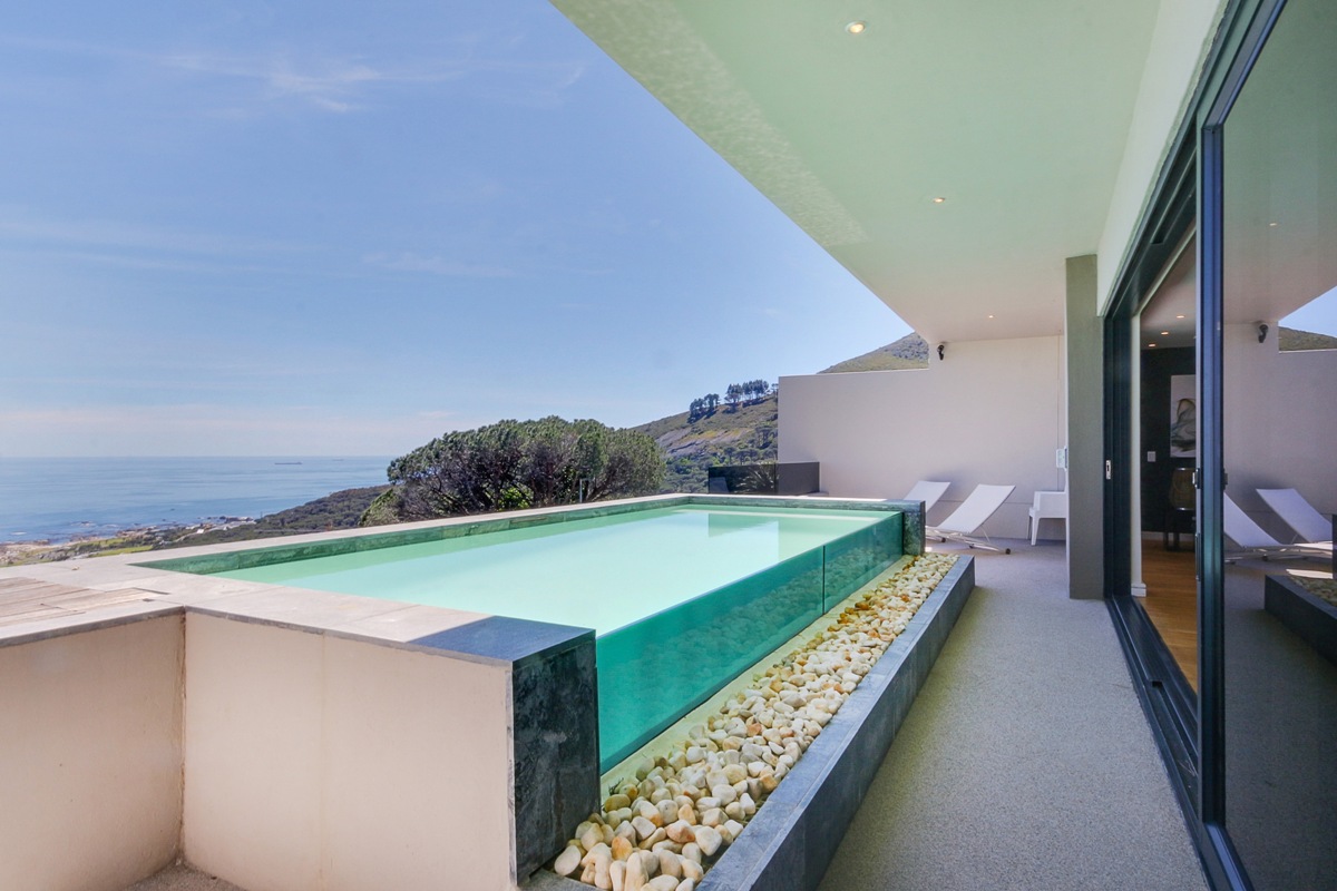 The balcony boasts a sparkling swimming pool and comfortable patio chairs. On the ground level is a plunge pool and sun loungers.