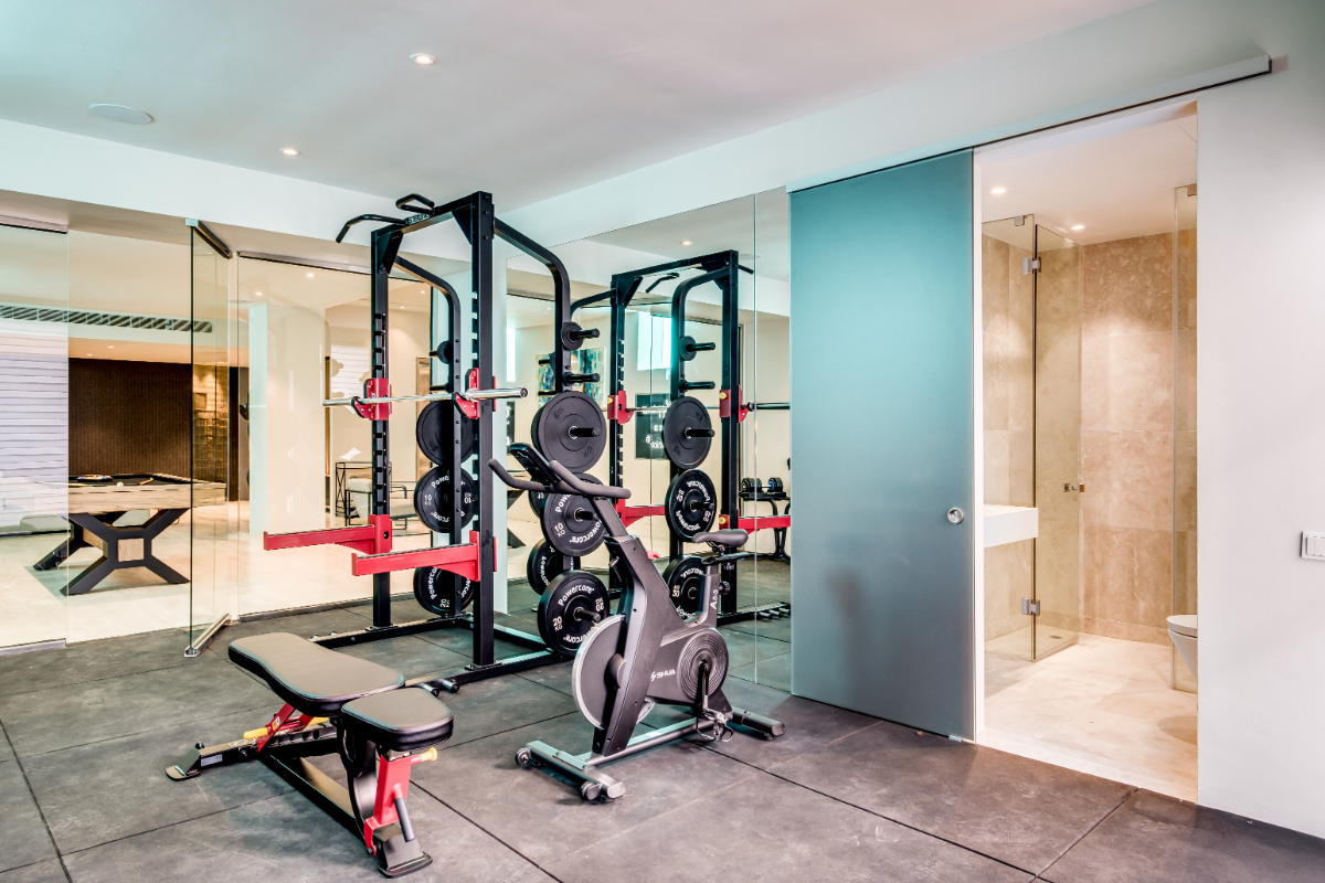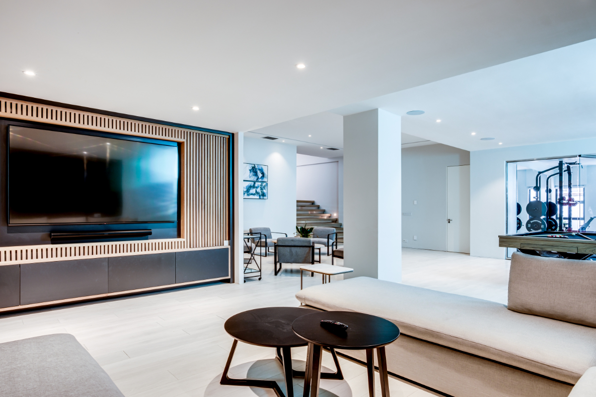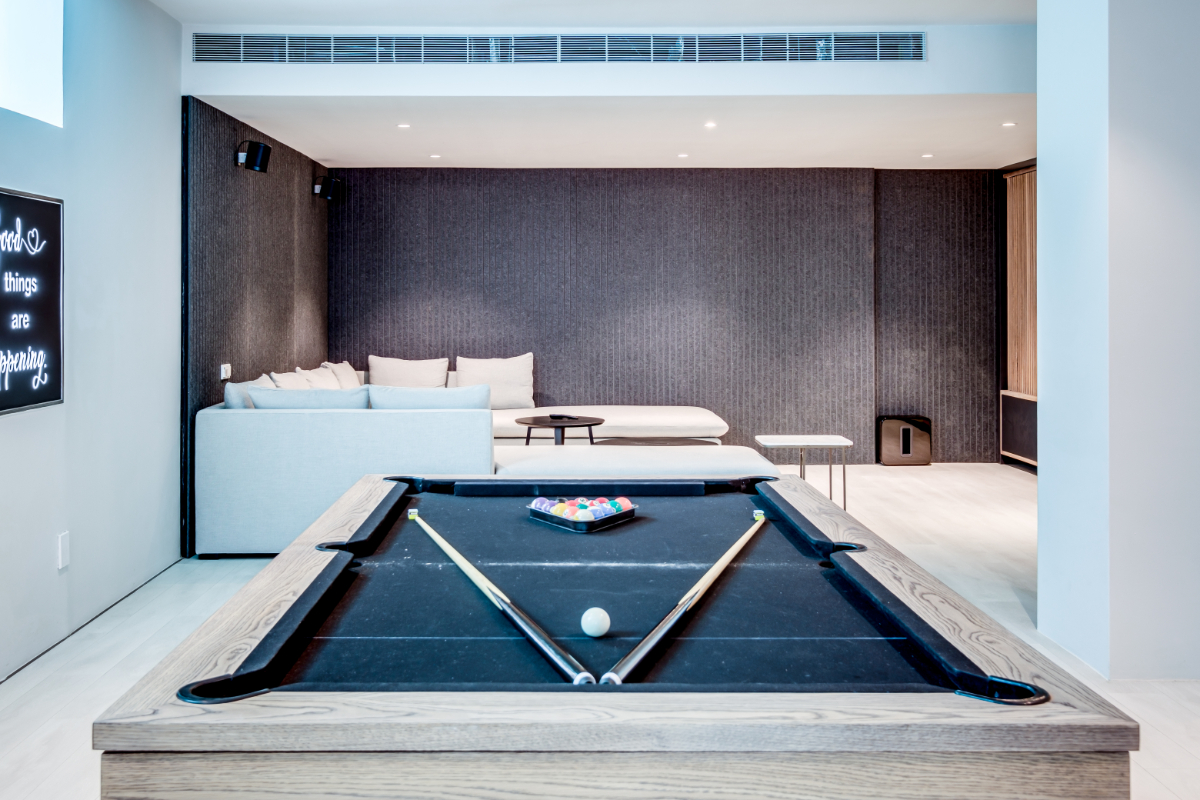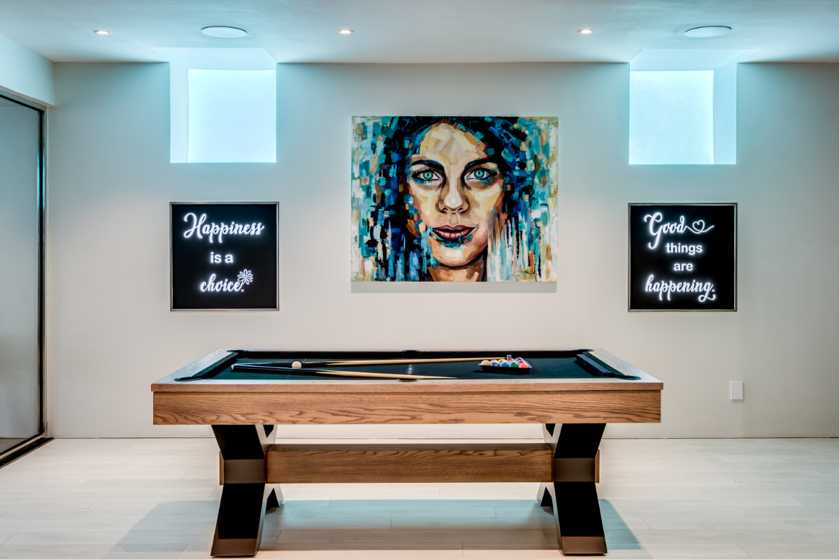 Study with desk and chair Laundry room with washer and dryer Gym with bathroom of shower and single vanity Entertainment area with pool table, seating for 15, TV, surround sound system, air con and wine cellar.