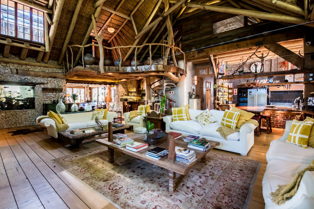 In the dining room, you will find a 16-seater Pierre Cronje dining table, built-in oak cupboards, curly Cherrywood flooring and concealed doors that lead out to a vast dining deck.